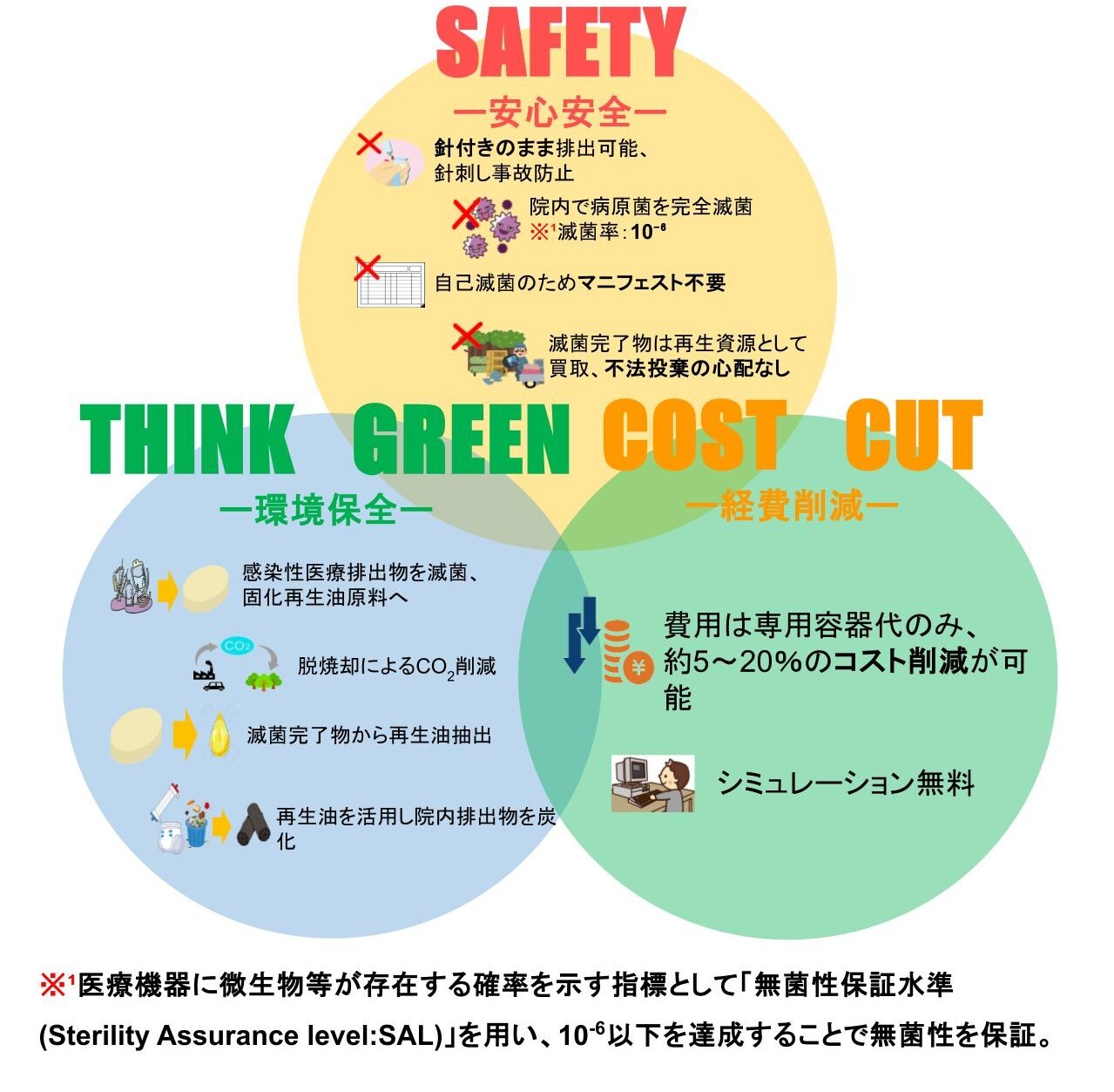 - 専用容器に収納した、樹脂系感染物を210℃の溶剤で完全溶融滅菌。滅菌率は10⁻⁶達成。(世界初)